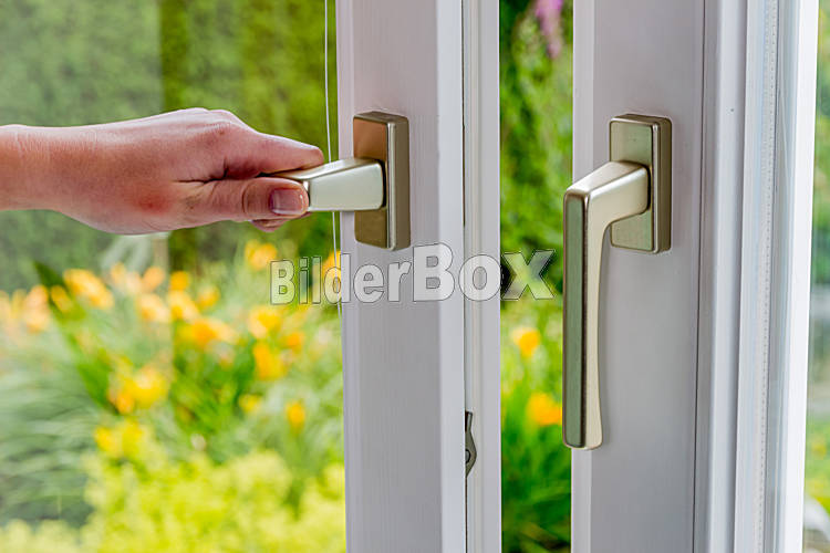 Beschreibung Eine Frau öffnet ein Fenster zum Lüften der Wohnung. Frische Luft im Zimmer