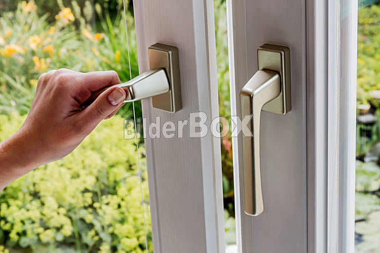 Beschreibung Eine Frau öffnet ein Fenster zum Lüften der Wohnung. Frische Luft im Zimmer
