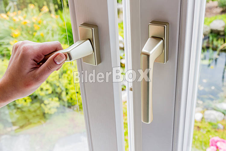 Beschreibung Eine Frau öffnet ein Fenster zum Lüften der Wohnung. Frische Luft im Zimmer