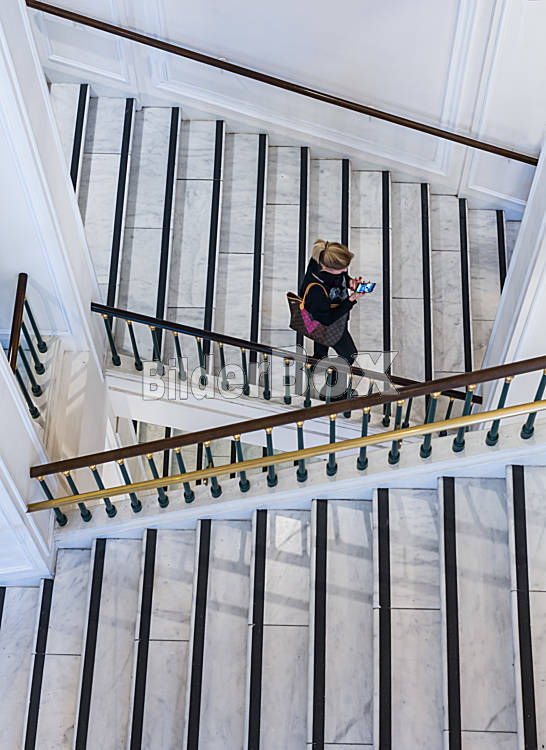 Beschreibung Eine Frau prüft Ihr Smartphone nach neuen Nachrichten auf der Treppe der "Albertina" in Wien.