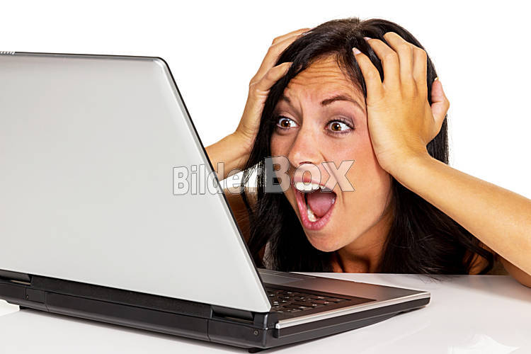 Beschreibung Eine junge Frau hat Stress mit Ihrem Laptop Computer. Symbolfoto für Datencrash, Spam und Computerviren