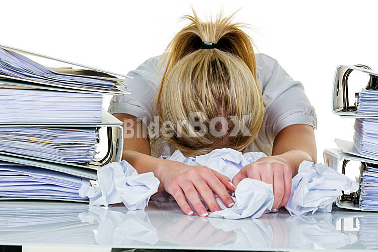 Beschreibung Junge Frau im Büro ist mit der Arbeit überfordert. Burnout bei Arbeit oder Studium.