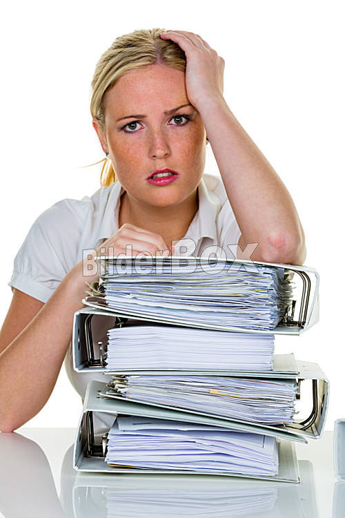 Beschreibung Junge Frau im Büro ist mit der Arbeit überfordert. Burnout bei Arbeit oder Studium.