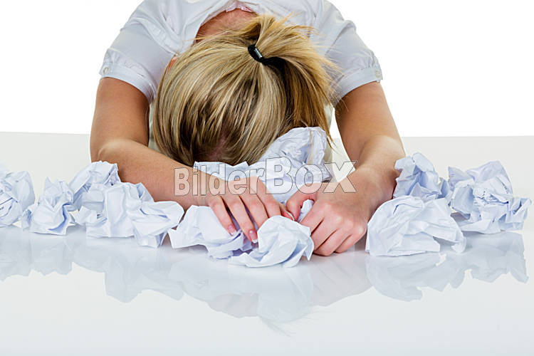 Beschreibung Junge Frau im Büro ist mit der Arbeit überfordert. Burnout bei Arbeit oder Studium.