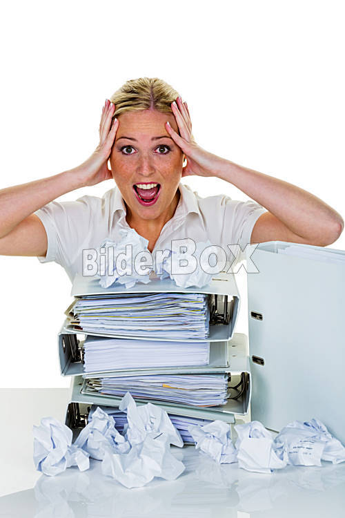 Beschreibung Junge Frau im Büro ist mit der Arbeit überfordert. Burnout bei Arbeit oder Studium.