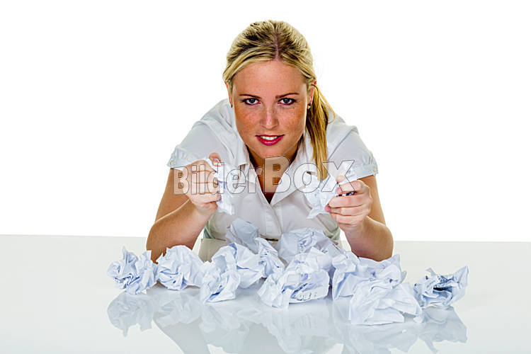 Beschreibung Junge Frau im Büro ist mit der Arbeit überfordert. Burnout bei Arbeit oder Studium.