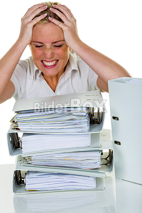 Beschreibung Junge Frau im Büro ist mit der Arbeit überfordert. Burnout bei Arbeit oder Studium.