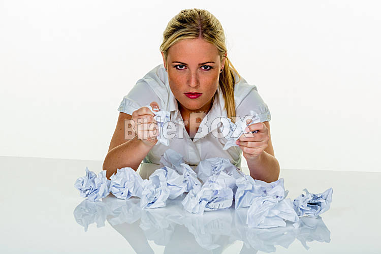 Beschreibung Junge Frau im Büro ist mit der Arbeit überfordert. Burnout bei Arbeit oder Studium.