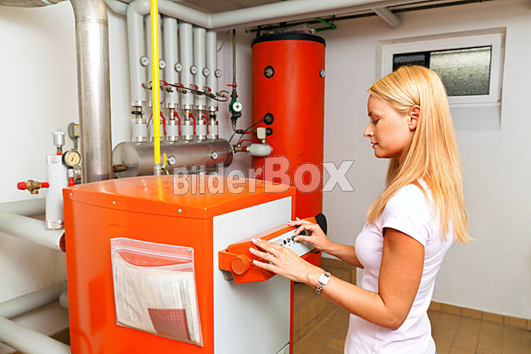 Beschreibung Eine junge Frau im bei Heizung im Heizungskeller. Energie sparen