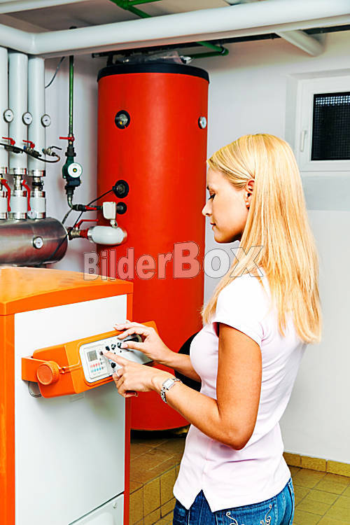 Beschreibung Eine junge Frau im bei Heizung im Heizungskeller. Energie sparen
