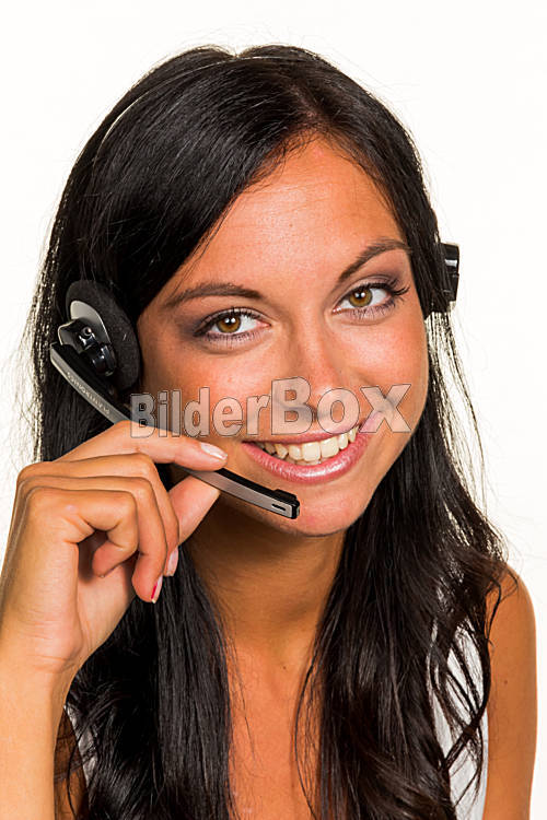 Beschreibung Eine junge Frau in einem Kundencenter telefoniert mit Kunden mit einem Headset
