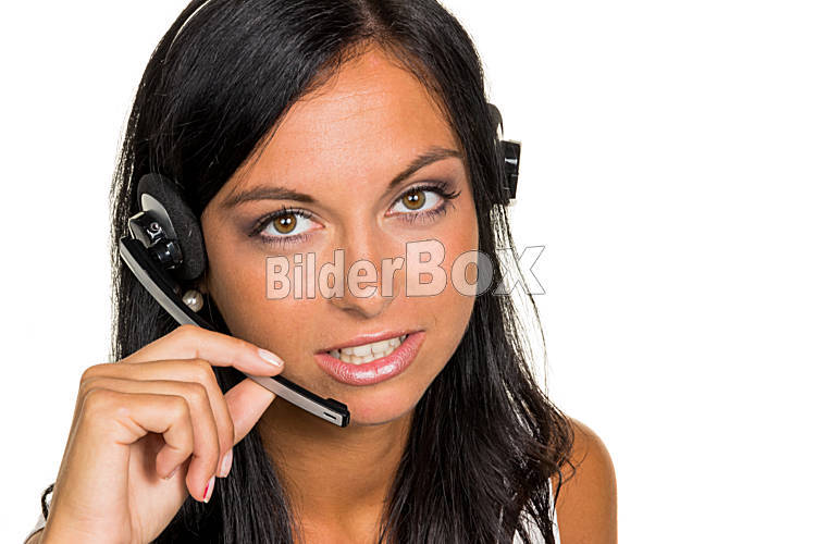 Beschreibung Eine junge Frau in einem Kundencenter telefoniert mit Kunden mit einem Headset
