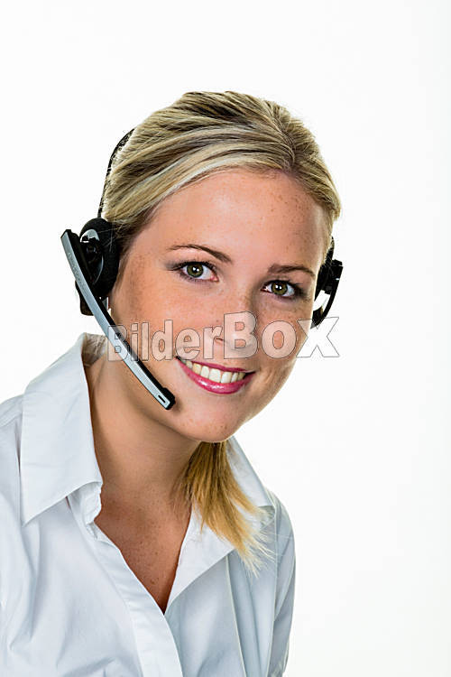 Beschreibung Junge Frau mit Headset telefoniert im Büro bei Auftragsannahme. Hotline und Kundenservice.