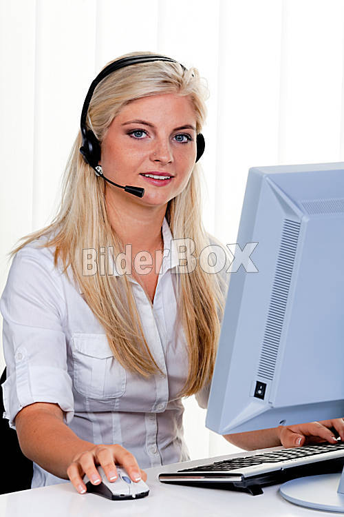 Frau mit Headset und Computer bei Hotline