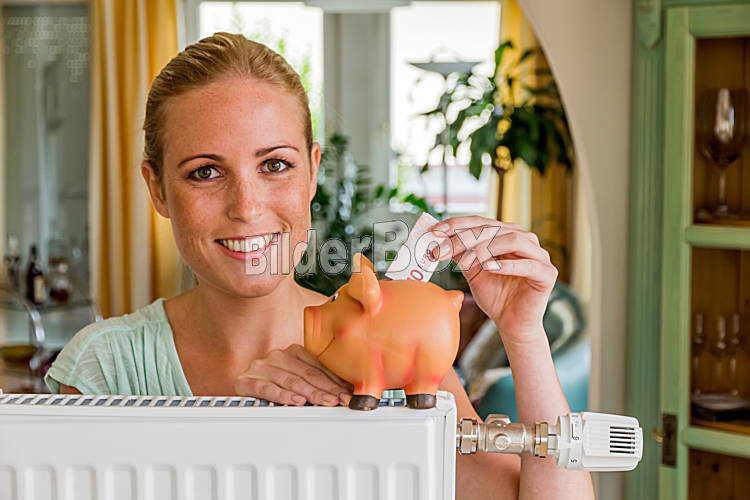 Beschreibung Eine junge Frau mit einem Heizkörper und einem Sparschwein. Symbolfoto für Sparen bei Energie und Heizung
