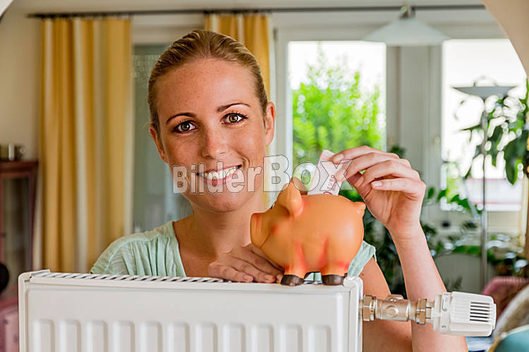 Beschreibung Eine junge Frau mit einem Heizkörper und einem Sparschwein. Symbolfoto für Sparen bei Energie und Heizung