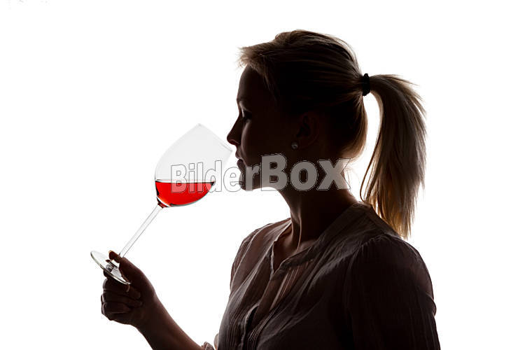 Beschreibung Eine junge Frau bei einer Weinverkostung. Probiert ein Glas Rotwein im Rotweinglas
