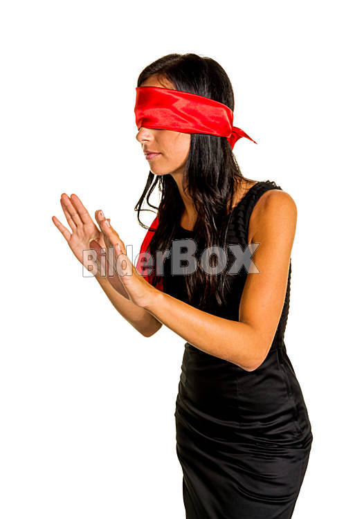 Beschreibung Eine junge Frau mit verbundenen Augen.
