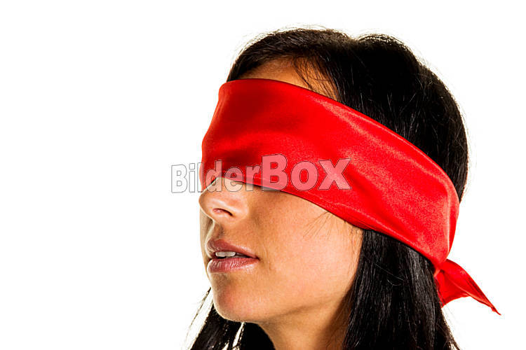 Beschreibung Eine junge Frau mit verbundenen Augen.
