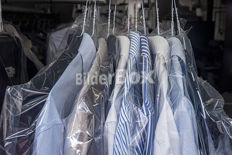 Beschreibung In Plastik verpackte Hemden in einer Wäscherei - Textilreinigung