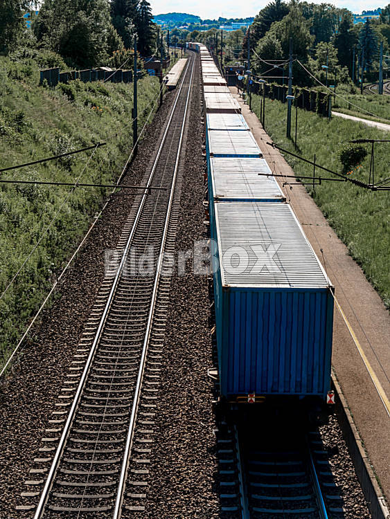 Beschreibung Ein Zug mit Gütern auf einer Bahnstrecke