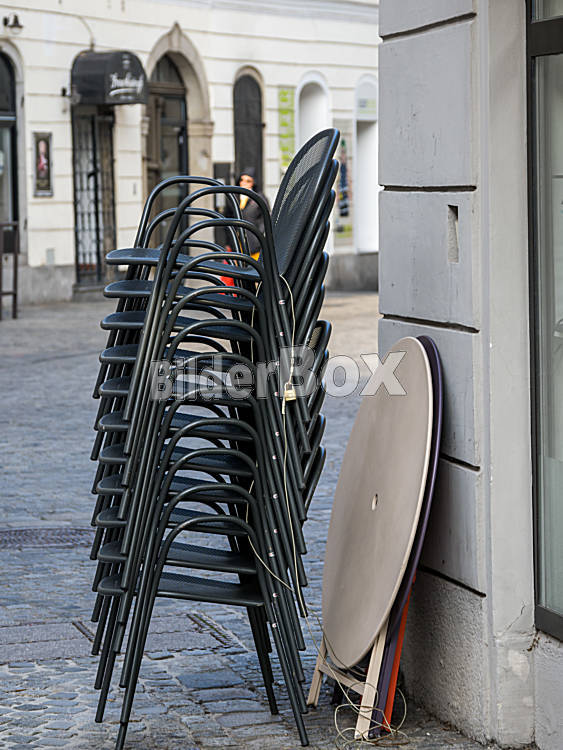 Beschreibung Gestapelte Sessel in einem Gastgarten wegen Corona Lockdown