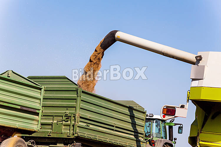 Beschreibung Ein Getreidefeld mit Weizen bei der Ernte. Ein Mähdrescher bei der Arbeit.