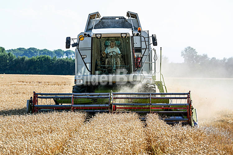 Beschreibung Ein Getreidefeld mit Weizen bei der Ernte. Ein Mähdrescher bei der Arbeit.