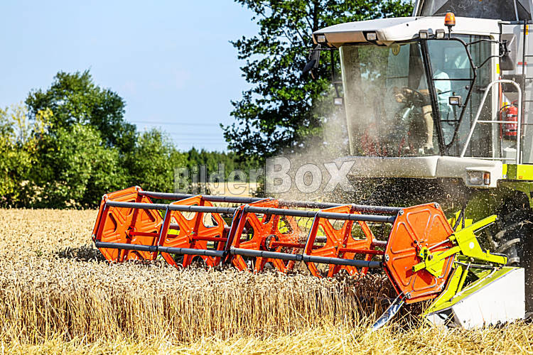 Beschreibung Ein Getreidefeld mit Weizen bei der Ernte. Ein Mähdrescher bei der Arbeit.