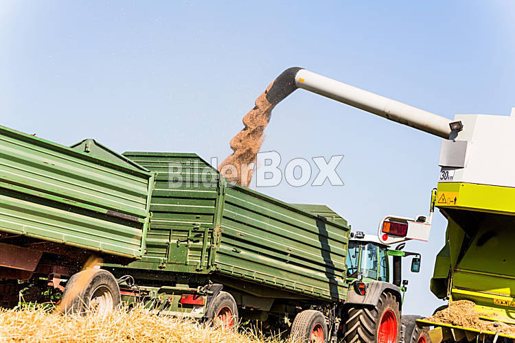 Beschreibung Ein Getreidefeld mit Weizen bei der Ernte. Ein Mähdrescher bei der Arbeit.