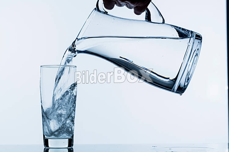Beschreibung Reines Wasser wird in ein Wasserglas aus einem Krug eingeleert. Frisches Trinkwasser