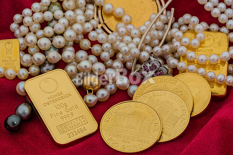 Beschreibung Gold in Münzen und Barren mit Schmuck auf rotem Samt. Symbolfoto für Reichtum, Luxus, Reichensteuer.
