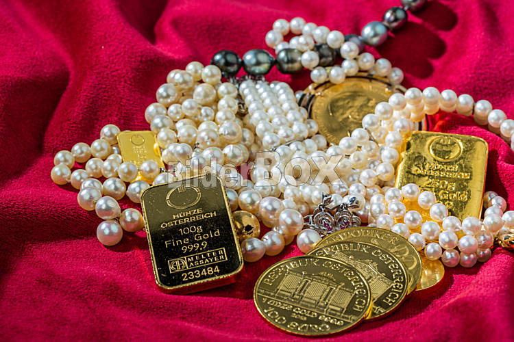 Beschreibung Gold in Münzen und Barren mit Schmuck auf rotem Samt. Symbolfoto für Reichtum, Luxus, Reichensteuer.