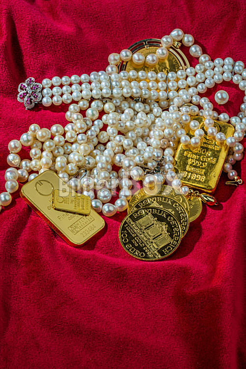 Beschreibung Gold in Münzen und Barren mit Schmuck auf rotem Samt. Symbolfoto für Reichtum, Luxus, Reichensteuer.