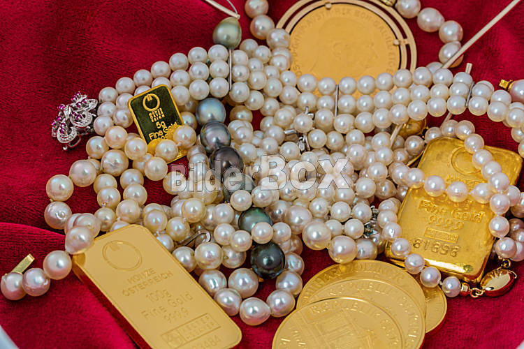 Beschreibung Gold in Münzen und Barren mit Schmuck auf rotem Samt. Symbolfoto für Reichtum, Luxus, Reichensteuer.