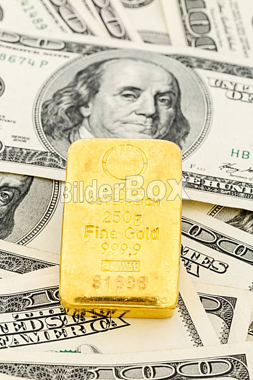 Beschreibung Goldbarren auf Dollarscheinen, Symbolfoto für Goldreserven, Wechselkurse, Kapitalanlage, Sicherheit