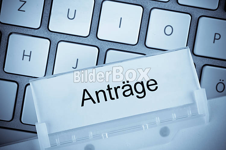 Beschreibung Die Mappe eines Hängeregisters vor einer Computertastatur zum Thema Anträge