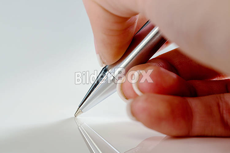 Beschreibung Eine Hand mit einer Füllfeder bei der Untrerschrift unter einem Vertrag oder Testament.