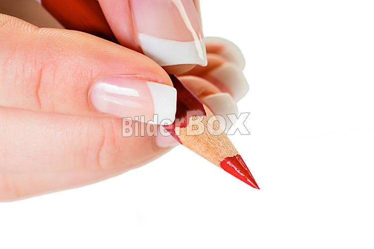 Beschreibung Eine Hand hält einen roten Stift. Symbolfoto für Einsparungen und Budegt Kürzungen.