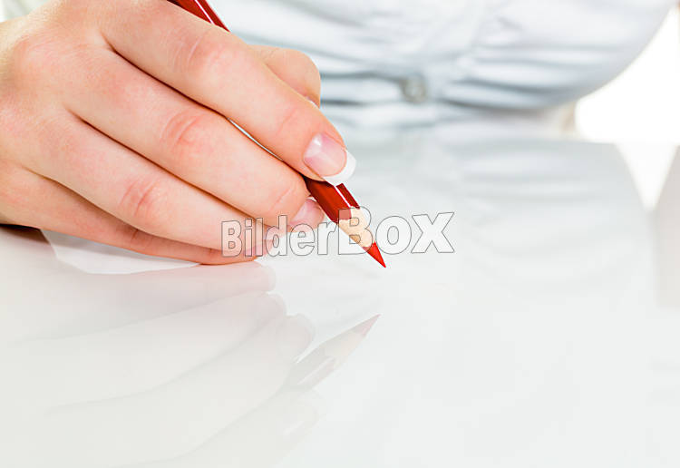 Beschreibung Eine Hand hält einen roten Stift. Symbolfoto für Einsparungen und Budegt Kürzungen.
