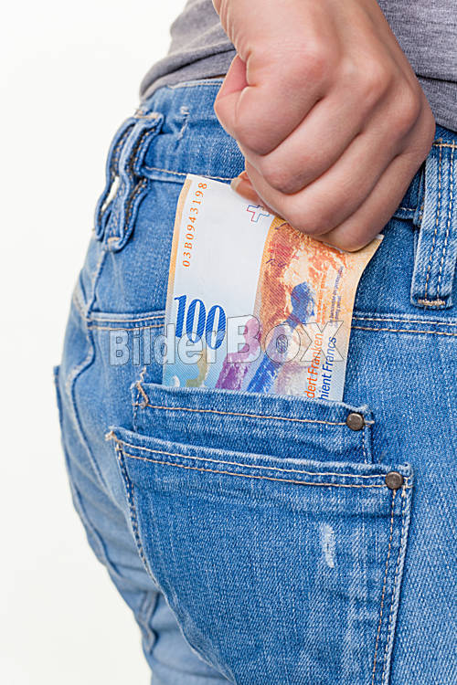 Beschreibung Die Hand einer jungen Frau zieht einen Schweizer Franken Geldschein aus der Tasche ihrer Jeans
