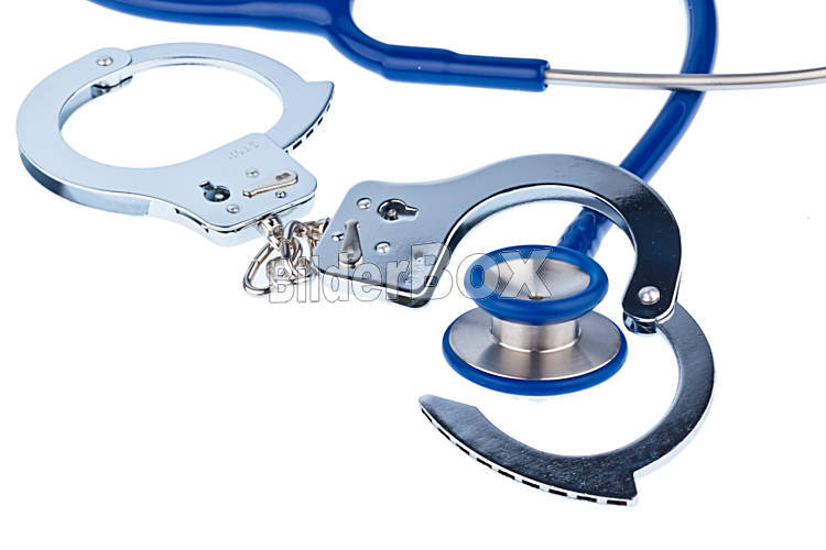 Beschreibung Handschellen und ein Stethoskop liegen auf weißem Hintergrund.