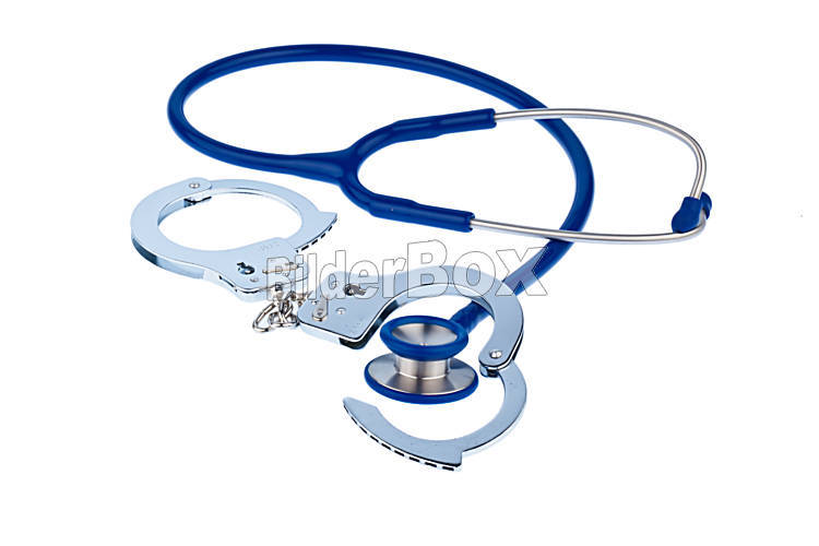Beschreibung Handschellen und ein Stethoskop liegen auf weißem Hintergrund.