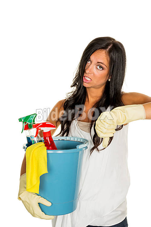 Beschreibung Eine junge Frau ärgert sich, dass sie den Hausputz machen muss.