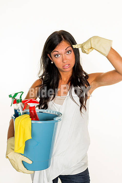 Beschreibung Eine junge Frau ärgert sich, dass sie den Hausputz machen muss.