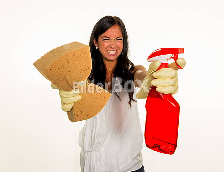Beschreibung Eine junge Frau ärgert sich, dass sie den Hausputz machen muss.