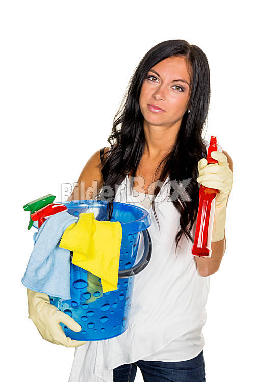 Beschreibung Eine junge Frau ärgert sich, dass sie den Hausputz machen muss.