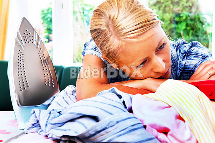 Beschreibung Eine junge Hausfrau beim Bügeln mit Bügeleisen und Wäsche.