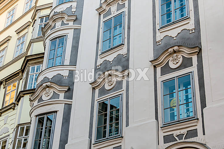 Beschreibung Historische Stadthäuser Fassaden, Symbol für Architektur, Altbauten, Dämmung. Linz, Altstadt, Österreich