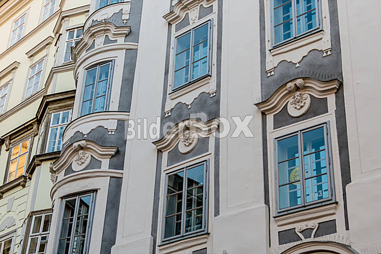 Beschreibung Historische Stadthäuser Fassaden, Symbol für Architektur, Altbauten, Dämmung. Linz, Altstadt, Österreich